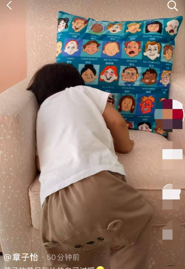 看着儿子爬不上去,章子怡一开始忍不住想帮忙用手去推他上沙发,最后小儿子还是凭借自己的努力终于爬了上去。