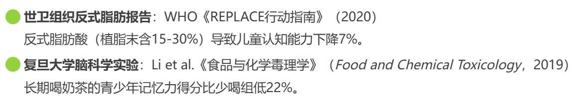 复旦大学实验发现,长期喝奶茶的青少年,记忆力比同龄人低22%——相当于背10个单词忘4个。世卫组织也指出反式脂肪能让儿童认知能力衰退7%。