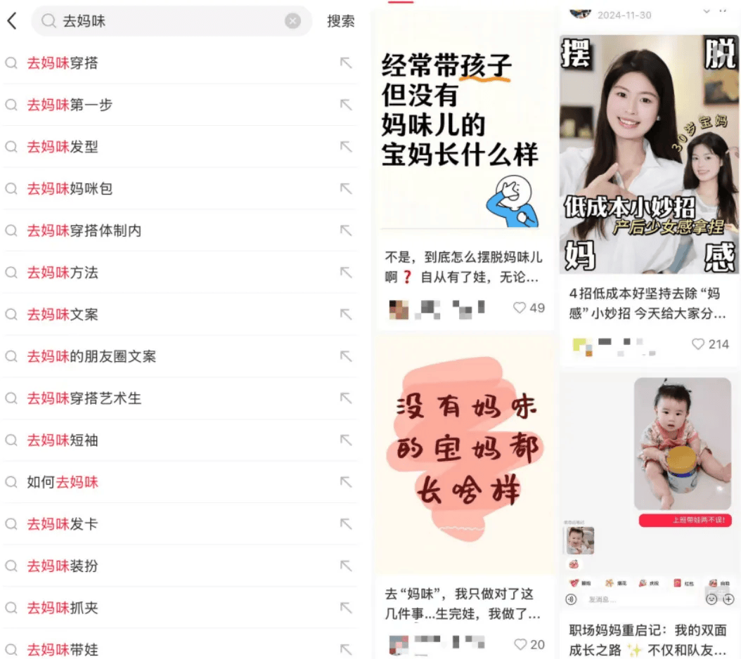 在小红书搜索“去妈味”,你可以看到一套360度全方位的关键词。从穿搭、发型,到具体的商品推荐,甚至还包括“如何带娃不显得妈味”。这样一本正经的讨论显得有点荒诞:孩子不是石头缝里蹦出来的,既要生育子女又要不像“妈妈”,怎么不去发明永动机呢?