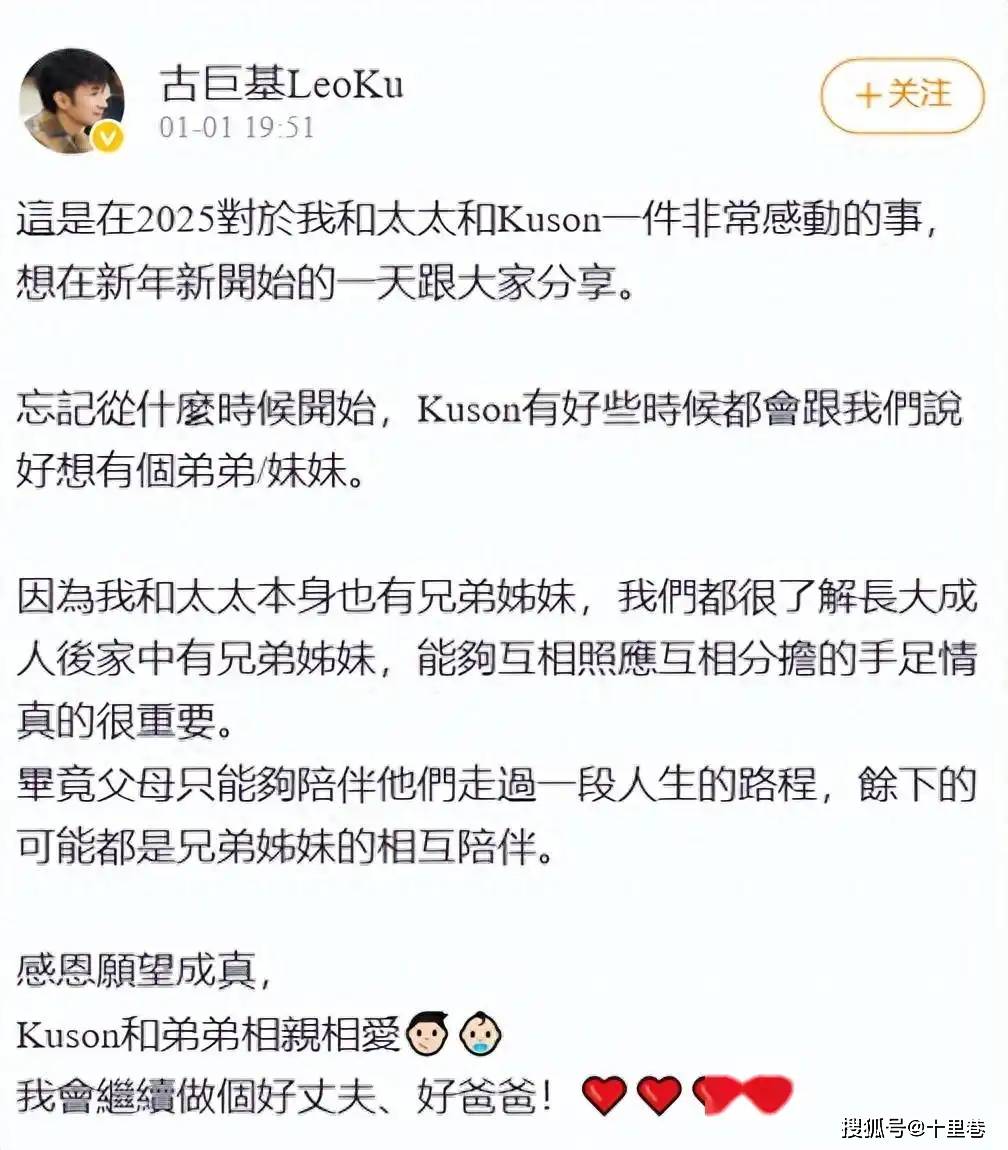 也希望古巨基一家四口能够幸福快乐,期待他们的二胎儿子健康成长,也期待古巨基能够在工作和家庭之间找到平衡,给家人带来更多的快乐和幸福。